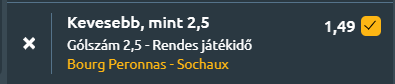 - Ez már a francia 3. vonal, amiről általánosan el lehet mondani, hogy védekezésorientált csapatok vannak és az underes meccsek a gyakoriak. Az első találkozón a kiesés elől menekülő Bourg-en-Bresse a jóval stabilabb, negyedik helyen álló Sochaux-t fogadja, minden jel szerint kevés góllal. A Bourg-en-Bresse gyenge szezonbeli szereplése ellenére bizakodva várhatja a találkozót, hiszen legutóbb 2–3-ra legyőzte Selongey csapatát, és az elmúlt öt meccséből kettőt is megnyert. A 16. helyen álló együttes azonban továbbra is komoly problémákkal küzd: a bajnokságban mindössze egyszer nyert, nyolcszor kikapott és négyszer játszott döntetlent, mindössze 0.69-es gólátlaggal, miközben 1.46 gólt kap mérkőzésenként. A Sochaux ezzel szemben sokkal kiegyensúlyozottabb, legutóbbi fellépésén 0–6-tal intézte el a Sarre Uniont, és a szezonban hat győzelem, négy vereség és három döntetlen mellett 1.38-as rúgott és mindössze 0.69-es kapott gólátlagot mutat. Az egymás elleni mérleg kiegyenlített: az utóbbi öt meccsből kettőt-kettőt nyertek a felek, egyszer döntetlen született, és a gólátlagok is visszafogottak voltak. A legutóbbi bajnoki találkozójukat ugyan a vendéglátó mostani csapat nyerte 0–1-re idegenben, de összességében mindkét fél teljesítménye inkább a megfontoltabb, óvatos játékképet vetíti előre. Ezúttal is 2,5 gól alatti találkozóra van nagyobb esély.