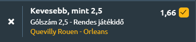 - Rouen városa a helyszín, ahol a 15. helyezett Quevilly Rouen és a nyolcadikként álló Orléans csap össze, egy olyan mérkőzésen, amelynek előjelei alapján inkább óvatos, visszafogott góltermés várható. A Quevilly Rouen gyenge formában van, a legutóbbi tíz mérkőzéséből ugyan hétszer is 2,5 gól feletti eredmény született, ám jelenlegi teljesítménye sokkal bizonytalanabb, a legutóbbi fellépésén 2–1-re kikapott Le Puy-en-Velay ellen, az elmúlt öt meccsén három vereség és két döntetlen szerepel, miközben mindössze 0.8 gólt szerzett átlagosan és 2.0-t kapott. A csapat a bajnokságban mindössze kétszer nyert, nyolcszor veszített és háromszor játszott döntetlent. Az Orléans ezzel szemben stabilabbnak tűnik, hiszen az utóbbi tíz meccsén nyolcszor esett 2,5 gól felett, legutóbb 1–2-re győzött az Union Saint-Jean ellen, és a legutóbbi öt találkozóján három győzelmet ért el, bár két vereség is becsúszott, 1.8-as rúgott és ugyanekkora kapott gólátlaggal. Az egymás elleni múlt ugyan kiegyensúlyozott, két-két győzelem és döntetlen az utóbbi öt meccsen, legutóbb pedig 0–0 , de összességében mindkét fél teljesítménye inkább hektikus, amely egy bizonytalan, óvatosabb mérkőzést vetíthet előre. A szezonban egyik csapat sem mutat acélos védekezést, viszont a gyenge eredménysor és a visszafogott helyezések együttese visszahúzhatja a játék tempóját. A csapatok formája és statisztikái egyaránt arra utalnak, hogy óvatosabb, kevésbé látványos mérkőzésre van nagyobb esély 2,5 gól alatt.