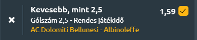- Szintén a Serie C, A-jelű csoportjában a Dolomiti Bellunesi hazai pályán fogadja az AlbinoLeffe együttesét egy olyan meccsen, ahol a hazai csapat utolsó öt meccsén szerzett és lőtt gólátlaga is alig haladja meg a FELET! A Dolomiti Bellunesi jelenleg a 16. helyen áll a tabellán, öt győzelemmel, nyolc vereséggel és hat döntetlennel, míg szezonbeli gólátlaga 0,89, kapott gólátlaga 1,37. Legutóbbi mérkőzésén 2–0-ra kapott ki a Trento Calcio 1921 ellen, az utolsó öt meccsén pedig 0,6 gólos átlagot szerzett és kapott. Az AlbinoLeffe a 14. helyen áll, öt győzelemmel, nyolc vereséggel és hat döntetlennel, átlagosan 1,42 gólt szerzett és 1,58-at kapott mérkőzésenként. Legutóbb 2–0-ra győzött az Alcione ellen, az utolsó öt meccsén 1,0 gólt szerzett és 1,4-et kapott. Az elmúlt egymás elleni mérkőzésük döntetlennel zárult 2–2-re. A csapatok alacsony átlagos gólszámai, az utóbbi mérkőzéseik visszafogott eredményei és a statisztikai előrejelzés alapján ez a találkozó valószínűleg kevés gólt hoz, így a 2,5 gól alatti eredmény a legvalószínűbb forgatókönyv.