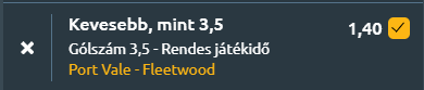 - Szintén az FA Kupában a League One utolsó helyén álló Port Vale fogadja a League Two középmezőnyéhez tartozó Fleetwoodot. A Port Vale a Blackpool elleni 5–1-es győzelemmel érkezik, ami eddigi legjobb eredményük volt a szezonban, ám ezt megelőzően három egymást követő vereséget szenvedtek el úgy, hogy egyetlen gólt sem szereztek. A gárda jelenleg az utolsó helyen áll a League One-ban, mindössze 18 ponttal 23 forduló után, és bár egy mérkőzéssel kevesebbet játszottak, tízpontos a hátrányuk a biztonságot jelentő zónától. Az év vége előtt edzőváltás is történt, Jon Brady érkezett Darren Moore helyére, de továbbra is kérdéses, mennyire tudja stabilizálni a csapat teljesítményét. A Fleetwood szintén visszafogott formát mutat, az elmúlt három bajnokiján mindössze egy pontot szerzett, és egyik találkozón sem talált be. A gárda jelenleg a 13. helyen áll, hat pontra a rájátszást érő pozícióktól, ráadásul komoly sérüléshullám sújtja őket, hiszen több alapember mellett két védő is kidőlt a legutóbbi mérkőzésen. A közelmúlt számai egyértelműen alacsony gólszámú mérkőzéseket mutatnak, a Port Vale utóbbi tíz meccséből hat végződött három gól alatt, míg a Fleetwood legutóbbi hat találkozójából öt szintén 2,5 gól alatt maradt. A két csapat gyenge támadójátéka, a közelmúltbeli gólképtelenség és az egymást erősítő negatív sorozatok alapján minden adott ahhoz, hogy ez az FA-kupa-mérkőzés is kevés találatot hozzon, így reálisan 2,5 gól alatti összecsapás várható.