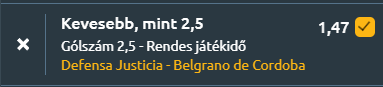 - Szintén az argentin bajnokság hatodik fordulójában kiegyenlítettnek ígérkező rangadón a Defensa y Justicia a Belgrano de Córdobát fogadj, ahol két veretlen csapat méri össze erejét. A Defensa y Justicia stabil rajtot vett, két győzelemmel és három döntetlennel továbbra is veretlen, meccsenként átlagosan 1,0 gólt szerez és mindössze 0,6-ot kap. Legutóbb 1–1-et játszott a Vélez Sarsfield ellen, ezzel ötmeccses veretlenségi sorozatát nyújtotta tovább, és bár hazai pályán még nem nyert ebben a szezonban, következetes teljesítményének köszönhetően a Zóna A harmadik helyén áll. Mérkőzései rendszerint szorosak, az utóbbi tíz bajnokijából kettőn még gól sem esett, a csapat fő erőssége a szervezett védekezés! A Belgrano de Córdoba jó formában van. A gárda öt forduló alatt 11 pontot gyűjtött, három győzelemmel és két döntetlennel szintén veretlen. Az elmúlt két meccsét egyaránt 1–0-ra nyerte meg a Banfield és az Independiente Rivadavia ellen, ami jól mutatja, mennyire hatékonyan őrzi az előnyét. Védekezése a liga egyik legjobbja, átlagban csupán 0,4 gólt kap meccsenként, találkozói pedig következetesen alacsony gólszámot hoznak: az utóbbi 24 bajnokiján és a legutóbbi 15 idegenbeli fellépésén egyaránt 3,5 gól alatt maradt az össztermés. Idegenben is nehezen verhető, hiszen az utolsó hét túrájából haton pontot szerzett. Azért várható kevesebb, mint 2,5 gól a meccsen, mert mindkét csapat kiemelkedően stabil védekezést mutat, mérkőzéseik rendszerint alacsony gólszámot hoznak, és a statisztikák is szoros, óvatos összecsapást sejtetnek.