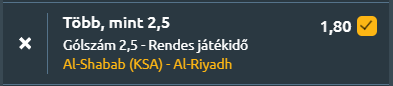 - Három meccs erejéig Szaúd-Arábiába utazunk, ahol rendszeresen gólgazdag meccseket játszanak. A Pro League 23. fordulójában az Al Shabab és az Al Riyadh csap össze a tabella alsó régiójában. Az Al Shabab legutóbb 3–1-re győzött a Damac FC otthonában, az utóbbi öt mérkőzéséből hármat megnyert, és ezeken meccsenként 2,0 gólt szerzett, miközben 1,4-et kapott. Az idényben 1,09 rúgott és 1,45 kapott gól az átlaga, mérlege 5 győzelem, 10 vereség és 7 döntetlen, jelenleg a 13. helyen áll. Az Al Riyadh 2–0-ra nyert az Al Kholood ellen, az elmúlt öt találkozón 1 győzelem, 2 vereség és 2 döntetlen a mérlege, 0,8-as rúgott és 0,8-as kapott gólátlaggal. A szezonban 0,95 gólt szerez és 1,86-ot kap meccsenként, 3 győzelem, 12 vereség és 7 döntetlen mellett a 15. pozíciót foglalja el. Az egymás elleni mérleg az Al Shabab fölényét mutatja: az utóbbi négy találkozóból hármat megnyert, egy döntetlen mellett, és ezeken átlagosan 2,0 gólt szerzett, míg az Al Riyadh 1,0-t. A legutóbbi egymás elleni mérkőzésen az Al Shabab idegenben 3–1-re győzött. Azért várható több mint 2,5 gól a meccsen, mert az Al Shabab az utóbbi öt mérkőzésén meccsenként 2,0 gólt szerez, és az egymás elleni találkozók is magas gólátlagot hoztak.