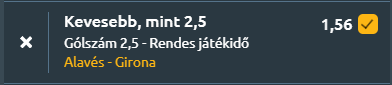 - A La Ligában az Alavés hazai pályán fogadja a Gironát, kiegyenlített küzdelem várható. A baszkok 14. helyen állnak 26 ponttal, mindössze két ponttal a kiesőzóna felett, és legutóbb 1–1-es döntetlent játszottak a Sevillával, amivel az elmúlt négy fordulóban hét pontot gyűjtöttek. Otthon viszonylag stabilak, 12 meccsből 18 pontot szereztek (5 győzelem, 3 döntetlen, 4 vereség). A Girona a 12. pozícióból érkezik, és ugyan nagy lendületet kapott a Barcelona elleni 2–1-es sikerrel, idegenben eddig 12 mérkőzésen csak 13 pontot gyűjtött. A katalánok az utóbbi hét bajnokijukból négyet megnyertek, de egyetlen vereségük is egy 1–0-s botlás volt a sereghajtó Real Oviedo ellen. Az egymás elleni közelmúlt is szoros csatákat mutat, az idényben 1–0-ra nyert a Girona, és a tavalyi megfelelő párosítás is 1–0-val zárult. Azért várható kevesebb mint 2,5 gól a meccsen, mert mindkét csapat közelmúltbeli egymás elleni találkozói szoros, egygólos meccseket hoztak, és a Girona idegenbeli mérlege sem utal gólzáporra.