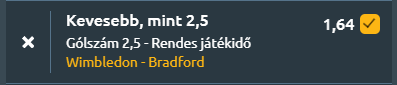 - Kiegyenlített esélyekkel, de visszafogott gólterméssel kecsegtet az AFC Wimbledon és a Bradford City összecsapása az angol League One mai játéknapján. A Wimbledon legutóbb 4–1-re kikapott a Cardiff Citytől. A Bradford 1–0-s győzelmet aratott a Stockport County felett. Az előző egymás elleni mérkőzést a Bradford nyerte 3–2-re hazai pályán, az utóbbi öt találkozó mérlege pedig enyhe vendégfölényt mutat (Bradford: 2 győzelem, Wimbledon: 1 győzelem, 2 döntetlen). A tabellán a Wimbledon a 16., a Bradford a 4. helyen áll. A hazaiak idényben 11 győzelmet, 6 döntetlent és 14 vereséget jegyeznek, meccsenként átlagosan 1,16 gólt szereznek és 1,45-öt kapnak. A Bradford mutatója 16 győzelem, 7 döntetlen és 8 vereség, 1,29 rúgott és 1,06 kapott gólos átlaggal. Az elmúlt öt meccsen a Wimbledon 2 győzelmet, 1 döntetlent és 2 vereséget hozott, miközben 1,6 gólt szerzett és 2,0-t kapott meccsenként. A Bradford ugyanebben az időszakban 3 győzelmet és 2 vereséget ért el, átlagban 1,0 gólt lőtt és 1,0-t kapott. A mutatók alapján szoros, taktikus mérkőzés várható, ahol egyik fél sem ígérkezik különösen gólerősnek, így a gólszám 2,5 alatt maradhat.