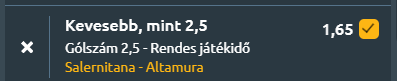 - Ez pedig már Európa, méghozzá a Napfényes Itália, ahonnan két mérkőzést is hoztam! A harmadosztály C-jelű csoportjában, a dobogóért küzdő Salernitana hazai pályán fogadja a középmezőnyben álló Team Altamurát, A vendégek busszal jönnek és be is tolják azt várhatóan a kapu elé, ha értitek, mire is gondolok. A Salernitana kiegyensúlyozott szezont fut, 16 győzelem mellett 7 vereséggel és 9 döntetlennel a harmadik helyen áll, miközben meccsenként 1,22 gólt szerez és kereken 1-et kap. Az utóbbi öt mérkőzésén azonban visszafogottabb arcát mutatja, két győzelem és két vereség mellett mindössze 0,6-os gólátlaggal dolgozik, ugyanennyi kapott gól mellett, legutóbb pedig 1–0-ra nyert a Crotone otthonában. A Team Altamura teljesítménye még inkább akadozó, 10 győzelem, 12 vereség és 10 döntetlen után a mezőny második felében helyezkedik el, támadásban mindössze 0,88 gólt termel, miközben 1,22-t kap. Az elmúlt öt meccsen egy győzelem mellett három vereséget szenvedett, és ugyanúgy 0,6-os gólátlagot hoz, mint ellenfele. Legutóbb 2–1-re kapott ki a Cataniától. Az egymás elleni mérleg minimális, de a Salernitana felé billen, az egyetlen találkozót 2–1-re nyerte meg idegenben. A lényeg tehát az, hogy a Salernitana legutóbbi tíz meccséből nyolc, az Altamuránál hét végződött 2,5 gól alatt, miközben a gólváltás esélye is alacsony. Mindkét csapat támadójátéka visszafogott, így könnyen elképzelhető, hogy egyetlen gól dönt, és ismét alacsony gólszám születik.