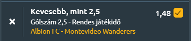 - Még mindig Uruguayban járunk, a Primera Divisiónban csap össze az Albion és a Wanderers, ahol az esélyek a hazaiak felé billennek, de a múlt alapján ismét szoros, kiegyenlített mérkőzés várható. Az Albion a 12. helyről várja az összecsapást, mérlege két győzelem, két döntetlen és három vereség, miközben meccsenként 1,14 gólt szerez és ugyanennyit kap. Formája ingadozó: az utóbbi öt találkozón egy győzelem mellett két vereség és két döntetlen, legutóbb viszont idegenben 1–0-ra legyőzte a Juventudot. A Wanderers a tabella 8. helyén áll, három győzelem, két döntetlen és két vereség a mutatója, 0,86-os rúgott és 1,29-es kapott gólátlaggal. Az utóbbi öt meccsen két győzelem, két vereség és egy döntetlen a mérlege, legutóbb 2–1-re nyert a Danubio ellen. Az egymás elleni közelmúlt teljesen kiegyenlített: az utolsó három találkozó mind döntetlennel zárult, és mindkét csapat átlagosan 0,7 gólt szerzett ezeken. A statisztikák és a közelmúlt alapján ismét szoros, kevés gólos párharc körvonalazódik, ahol egyik fél sem tud tartós fölényt kialakítani. Egy visszafogott meccs várható, ahol nagyobb az esélye a 2,5 gól alatti eredménynek.
