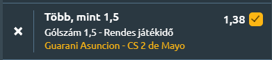- A paraguayi élvonalban Asunciónban csap össze a Guaraní és a 2 de Mayo, ahol kiegyenlített erőviszonyok mellett inkább nyíltabb, gólváltásos mérkőzés körvonalazódik. A Guaraní a 8. helyről várja a találkozót, mérlege három győzelem, négy döntetlen és négy vereség, miközben meccsenként 1,55 gólt szerez és 1,36-ot kap. Formája hullámzó, az utóbbi öt mérkőzésen egy győzelem, két döntetlen és két vereség a mutató, legutóbb 2–0-ra kikapott az Olimpiától. A 2 de Mayo a 10. helyen áll, három győzelem, három döntetlen és öt vereség a mérlege, támadásban visszafogottabb, átlagosan 0,73 gólt szerez, miközben ugyanúgy 1,36-ot kap. Az utóbbi öt meccsen viszont jobb ritmusban futballozik: három győzelem, egy döntetlen és egy vereség, legutóbb 2–0-ra nyert a Sportivo Luqueño ellen. Az egymás elleni mérleg enyhe Guaraní-fölényt mutat, az utolsó öt találkozóból hármat ők nyertek, kettőt a 2 de Mayo, döntetlen nem született, ugyanakkor a legutóbbi összecsapást a 2 de Mayo húzta be 1–0-ra. A gólok tekintetében enyhe elmozdulás látszik a nyitottabb játék felé, nagyobb az esély a 1,5 gól feletti eredményre!