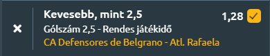 - És a gólos körutazásunkat Argentínában fejezzük be egy nagyon valószínű underes meccsen. A Primera B Nacional rangadóján két élcsapat csap össze, a harmadik helyen álló Defensores de Belgrano a közvetlen rivális Atlético Rafaela együttesét fogadja. A Defensores de Belgrano stabil és fegyelmezett játékot mutat, jelenleg veretlen a szezonban két győzelemmel és három döntetlennel, miközben meccsenként mindössze 0,4 gólt kap. Az utóbbi öt találkozóján is őrzi ezt az egyensúlyt, három döntetlen mellett két győzelmet aratott, és továbbra is alacsony gólátlag jellemzi, átlagosan egy gólt szerez és 0,4-et kap. Legutóbb gól nélküli döntetlent játszott, ami jól illeszkedik a trendbe, hiszen az utolsó tíz mérkőzéséből nyolcszor 2,5 gól alatt maradt az eredmény. Az Atlético Rafaela a negyedik helyről érkezik, szezonmérlege három győzelem, egy vereség és egy döntetlen, de támadójátéka visszafogottabb, mindössze 0,8 gólt szerez meccsenként. Védekezésben ugyanakkor stabil, szintén 0,4-es kapott gólátlaggal. Az elmúlt öt mérkőzésen három győzelem mellett két vereséget szenvedett, legutóbb azonban 3–0-ra kikapott. Az egymás elleni mérleg is szoros és kevés gólt hoz, a csapatok az utolsó öt találkozón átlagosan 0,8, illetve 0,4 gólt szereztek, és a legutóbbi összecsapásuk 0–0-val zárult. A számok egyértelműen a kevés gólos forgatókönyvet erősítik, mindkét csapat alacsony gólátlaggal dolgozik, stabil védekezéssel, és nagyobb az esélye annak, hogy legalább az egyik fél nem talál be.