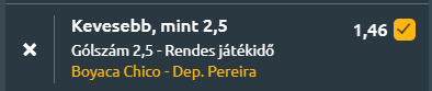 - Vissza Dél-Amerikában, ahol a kolumbiai bajnokságba látogatunk. A Boyacá Chicó hazai pályán fogadja a Deportivo Pereira csapatát a Liga BetPlay alsóházi rangadóján. A két együttes a tabella végéről várja az összecsapást, a Chicó a 19., míg a Pereira a 20. helyen áll, és mindkét fél vereséggel hangolt, előbbi 1–0-ra kapott ki a Cúcuta Deportivótól, utóbbi ugyanilyen arányban a Deportivo Calitól. A hazaiak szezonja gyenge, mindössze két győzelmet arattak, átlagosan 0,77 gólt szereznek és 1,62-t kapnak, ráadásul az utóbbi öt meccsükön is csak egyszer nyertek. A Pereira még nehezebb helyzetben van, nyeretlen a szezonban, hét vereség és hat döntetlen mellett, védekezése különösen lyukas, közel két gólt kap meccsenként. Formája sem javul, az elmúlt öt találkozón három vereség és két döntetlen a mérlege. Az egymás elleni mutató a Pereirának kedvez, az utóbbi öt meccsből kettőt megnyert, három döntetlen mellett, miközben a Chicó egyszer sem győzött. A statisztikák kevés gólt vetítenek előre, nagyobb az esélye annak, hogy legalább az egyik csapat nem talál be. Gyenge formájú csapatok csatája várható, ahol a Chicó minimális esélyfölénye mellett egy szoros, kevés gólos mérkőzés rajzolódik ki.
