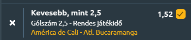 - Az América de Cali hazai pályán fogadja az Atlético Bucaramanga együttesét a rájátszásért zajló harcban. A hazaiak ingadozó formában érkeznek, legutóbbi öt meccsükből csak egyet nyertek meg, miközben 0,6 gólt szereznek és 1,0-t kapnak átlagban, azonban otthon rendkívül stabilak, 16 bajnoki óta veretlenek. A szezonban kiegyensúlyozott teljesítményt nyújtanak, védekezésük szervezett, amit jól mutat, hogy az utóbbi 14 mérkőzésük mindegyikén három és fél gól alatt maradt az össztermés. Az Atlético Bucaramanga formája visszaesett, négy meccs óta nyeretlen, bár összességében stabil csapat benyomását kelti, hiszen kevés gólt szerez és kap. Idegenben nehezen verhető, de gyakran döntetlenre játszik, és támadásban kevésbé hatékony. Az egymás elleni mérleg az América felé billen, amely az utóbbi találkozón is 2–1-re nyert. A két csapat játékát a feszes védekezés és a kevés gólos mérkőzések jellemzik, így most is inkább taktikai küzdelem várható. Az erős hazai mérleggel rendelkező América de Cali esélyesebb, egy szoros, kevés gólos mérkőzésen.