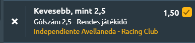 - Argentínába utazunk, ahol jó sokat fogunk tartózkodni. Az első mérkőzés mindjárt az élvonalból érkezik, ez a meccs egy igazi derbi lesz! Az Avellaneda-i derbi mindig különleges, ezúttal az Independiente fogadja a formában lévő Racing Clubot. Independiente az utóbbi öt meccséből kettőt nyert, egyet döntetlent játszott, kettőt elveszített, átlagosan 1,6 gólt szerzett és 1,4-et kapott, a Liga Profesional 9. helyén áll. Az utóbbi 16 mérkőzésen folyamatosan találtak be, de védelmük gyakran hibázik. Racing Club kilenc meccses veretlenségi sorozatban érkezik, az utóbbi ötből négyet megnyert és egy döntetlen, átlagosan 1,4 gólt szerezve és 0,9-et kapva, a 5. helyen. Az utóbbi 30 meccsükön 27-szer az első félidőben kevesebb mint 1,5 gól született. A derbijelleg és a szoros, kevés gólt hozó előző találkozók alapján ismét egy alacsony gólszámú mérkőzés várható, az under 2,5 a valószínűbb eredmény.