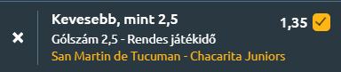 - Még mindig a gaucsók földjén maradunk, mégpedig az argentin másodosztályba látogatunk. San Martín de Tucumán hazai pályán fogadja a Chacarita Juniors-t a Primera B Nacional 13. fordulójában. San Martín de Tucumán az utóbbi öt meccséből kettőt nyert, hármat döntetlent játszott, átlagosan 1,4 gólt szerezve és 0,8-at kapva, a 6. helyen áll a ligában. Chacarita Juniors az utóbbi ötből egy győzelmet aratott, négyszer kikapott, átlagosan 0,8 gólt szerzett és 1,8-at kapott, jelenleg a 17. helyen. Az egymás elleni utolsó öt találkozóból kettőt nyert mindkét csapat, egyszer döntetlen született, San Martín átlagosan 0,8, Chacarita 0,6 gólt jegyzett. A statisztikák és a kevés gólra utaló előző mérkőzések alapján ismét egy under 2,5 gólos összecsapás várható.