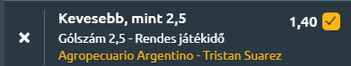 - Agropecuario Argentino hazai pályán fogadja a listavezető Tristán Suárez-t a Primera B Nacional 13. fordulójában. Agropecuario Argentino az utóbbi öt meccséből egyet nyert, kettőt elveszített és kettőt döntetlennel zárt, átlagosan 0,6 gólt szerezve és 1,0-et kapva. Tristán Suárez az utóbbi ötből három győzelmet aratott, kétszer döntetlent játszott, 1,4 gólt szerezve és 0,4-et kapva, jelenleg az 1. helyen áll. Az egymás elleni utolsó négy találkozóból Tristán Suárez háromszor győzött, Agropecuario egyszer, döntetlen nem volt, Agropecuario átlagosan 0,8, Tristán 1,5 gólt szerzett. A szezonban Agropecuario 2 győzelmet, 2 vereséget és 2 döntetlent jegyzett, 0,83 gólt szerezve és ugyanennyit kapva, míg Tristán 3 győzelem mellett 0 vereséget és 3 döntetlent ért el, 1,17 gólt szerezve és 0,33-at kapva. A gólos statokat elnézve, nincs kérdés, hogy esélyes az under 2,5!