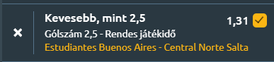 - Búcsúzunk Argentínától és a szombati gólos körutazásunktól is. Az Estudiantes de Buenos Aires hazai pályán fogadja a Central Norte de Saltát a Primera B Nacional 13. fordulójában. Estudiantes az utóbbi öt meccséből egyet nyert és négyet elveszített, átlagosan 0,6 gólt szerezve és 1,4-et kapva, a szezonban 1 győzelem, 5 vereség mellett 0,5 gólt átlagolt meccsenként és 1,33-at kapott. Central Norte de Salta az utóbbi ötből két győzelmet aratott, egyszer vereséget szenvedett és kétszer döntetlent játszott, átlagosan 0,4 gólt szerezve és 0,4-et kapva, a szezonban 2 győzelem, 2 vereség és 2 döntetlen mellett 0,33 gólt szerezve és 0,5-öt kapva. Az utóbbi tíz meccsen Estudiantes nyolcszor, Central Norte hétszer zárt under 2,5 góllal, a legutóbbi head-to-head 0-1 volt. Az argentin kettes meccseken biztos sokat beszélgetnek a nézők, mert a gól ritka vendég! Ma sem lesz több, mint 2,5 ezen a meccsen.