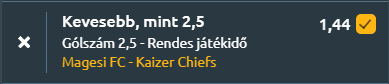 - Dél-Afrikában fejezzük be a gólos körutazásunkat, a Magesi a Kaizer Chiefs ellen lép pályára, ahol a tabella 16. és 3. helyezettje találkozik. A hazaiak legutóbb 1–0-ra kikaptak, és a szezonban mindössze 0,7 gólt átlagolnak, miközben 12 vereséget szenvedtek. A Chiefs legutóbb 2–0-ra nyert, és stabil védekezést mutat 0,59-es kapott gólátlaggal. Az egymás elleni mérleg is mellettük szól, az utóbbi három meccsből kettőt megnyertek, és több mint kétszer annyi gólt szereznek átlagban. A gólstatisztikák egyértelműen visszafogott képet mutatnak! Mindkét csapat védekező felfogásban focizik, az over 2,5 esélye mindössze 36%, és az utóbbi tíz meccsből a Magesi nyolcszor, a Chiefs hétszer maradt ez alatt. Ma sem várható több, mint 2,5 gól a meccsen!