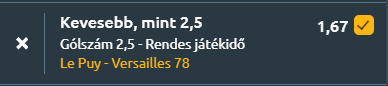 - Búcsúzunk Franciaországtól ezzel a meccsel, ahol a Le Puy-en-Velay és a Versailles összecsapása két közvetlen rivális találkozója lesz a National mezőnyében, a hazaiak 7., a vendégek pedig 6. helyről várják a kezdést. A Le Puy legutóbb 0–0-ra végzett a Quevilly Rouen ellen, de az egymás elleni mérleg egyértelműen mellettük szól, három találkozóból kettőt megnyertek, egy döntetlen mellett, átlagban 2,0 gólt szerezve, miközben a Versailles mindössze 0,3-at. A szezonban 12 győzelem, 7 vereség és 9 döntetlen áll a nevük mellett, 1,43-as rúgott és 1,0-s kapott gólátlaggal, az utóbbi öt meccsük pedig három győzelmet, egy vereséget és egy döntetlent hozott, 1,6-os rúgott és 0,8-as kapott gólátlaggal. A Versailles ezzel szemben 4–0-s győzelemmel érkezik a Châteauroux ellen, és a szezonban 14 győzelmet, 9 vereséget és 5 döntetlent jegyez, 1,39-es rúgott és 1,04-es kapott gólátlaggal. Az utóbbi öt meccsük két győzelmet, két vereséget és egy döntetlent hozott, 1,4-es rúgott és 1,0-s kapott gólátlaggal. A két csapat formája alapján szoros, védekezésközpontú mérkőzés várható, ahol a Le Puy stabilabb védekezése és jobb egymás elleni mérlege lehet a döntő tényező, míg a Versailles támadásban mutat kiegyensúlyozott teljesítményt. Nem várható több, mint 2,5 gól a mérkőzésen.