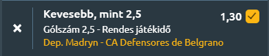 - A Deportivo Madryn és a Defensores de Belgrano egy igazi védekezésorientált, szoros meccset játszanak majd, ahol a hazaiak 9., a vendégek pedig 3. helyről várják a kezdő sípszót. A Madryn legutóbb 1–0-ra kikapott a Ciudad de Bolívartól, de az utóbbi öt meccsükön három győzelmet is szereztek, 1,8-as lőtt és mindössze 0,8-as kapott gólátlaggal. A szezonban 1,22 gólt szereznek és 0,89-et kapnak meccsenként, ami stabil teljesítményt jelez. A Defensores ezzel szemben 3–0-s vereséggel hangolt a Racing de Córdoba ellen, és az utóbbi öt találkozón csak egyszer nyert, három döntetlen mellett. A szezonban 0,89 gólt lőnek és 0,67-et kapnak átlagban, ami erős védekezést, de visszafogott támadójátékot mutat. A két csapat egymás elleni mérlege a Madryn felé billen, három meccsből kettőt megnyertek, egyszer döntetlen született, és 1,7-es gólátlagot hoztak a vendégek 1,0-jával szemben. A legutóbbi találkozó 0–0 lett, ami jól illeszkedik a mostani statisztikai képletbe. Mindkét csapat alacsony gólátlaggal érkezik, a Defensores különösen kevés gólt kap, a Madryn pedig stabil, kontrollált játékot mutat. Itt ma akár egy gól is dönthet!