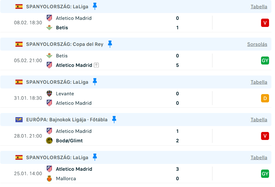 - Az Atlético az elmúlt hetekben „felült a hullámvasútra”. A Király Kupa negyeddöntőjében, február 5-én a Matracosok a szezon egyik legjobb teljesítményét nyújtva idegenben 5-0-ra győzték le a Betist. Aztán három nap múlva, a La Ligában ugyanez az ellenfél érkezett a Metropolitanóba, és a madridiak 1-0-s vereséget szenvedtek.