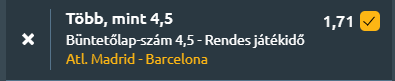 - Abszolút háromesélyesnek tartjuk a találkozót. Úgy véljük, a papírformának megfelelően könnyen jöhet – a bukik által alaposan „beárazott” és ezért értékét vesztett… – gólzápor, de az is előfordulhat, hogy – mint a hasonló súllyal bíró párharcok első felvonásain gyakran – a tét rányomja a bélyegét a meccsre. Így, tekintettel a várható feszültségre és az elfogadható kockázat-hozam arányra, inkább a büntetőlapok piacán nézelődünk. Szó nincs arról, hogy különösebben durva lenne a két csapat: a Barcelona négy sárga lapot gyűjtött az elmúlt öt meccsén, míg az Atlético nyolcat, és a decemberi bajnokijukon is mindössze kétszer nyúlt a zsebéhez a spori. Ez azonban egy olyan küzdelem első menete, amely túlmutat egy „szimpla” kupacsatán, a rivalizálás súlyát hordozza magán, s alapvetően határozza meg a két csapat és különösen a tavalyi kiesés miatt bosszúra szomjazó Matracosok szezonját… A Király Kupa múlt évi elődöntőjének első találkozóján 5-ször, a visszavágón 9-szer villant a sárga. A Metropolitanóban csütörtök este Juan Martinez Munuera fújja a sípot, aki meccsenként 4,4 büntetőlapot átlagol ebben a szezonban.