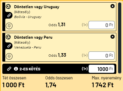 - Bolívia és Venezuela a tabella két utolsó helyezettje. Nagyon gyengén állnak, csakis a magaslat az ami Bolívia mellett áll. Uruguaynak és Perunak még van esélye, hogy bejussanak a 3. - 6. közé, ami vagy kijutást, vagy VB-osztályozót ér, de ehhez meg kellene táltosodniuk. Ezen a két meccsen nem kapnak ki a vendégek, a döntetlen becsúszhat, de az már kudarcnak minősülne számukra.