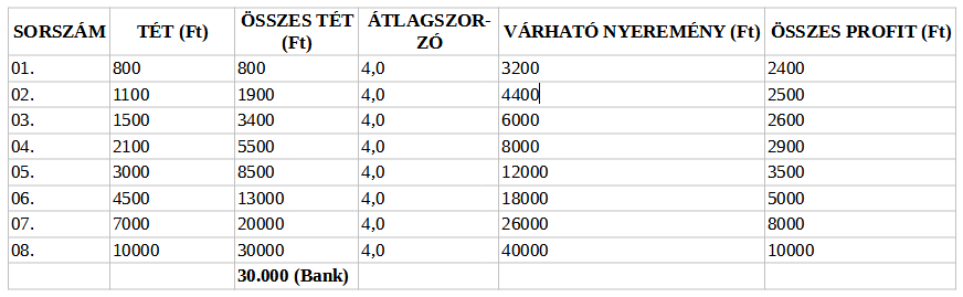- A harmadik oszlopban látható az adott sorban eddig elköltött összes tét, vagyis az a pénz amit addig a pillanatig már ráköltöttünk a játékra! Az utolsó-, 8. fogadásnál elfogy a 30.000 forint, ha nem jön be!