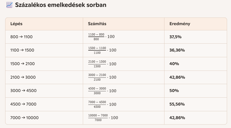 - Tehát a jobb oldali oszlopban olvashatóak azok a százalékos értékek, amelyek mennyiségével nőtt a TÉT-ek összege lépésről-lépésre az első havi táblázatba! Nincs is más dolgunk, mint a második táblázatban is végigszámolni a lépéseket! Az új KEZDŐTÉT már megvan, hiszen kiszámoltuk: 1300 forint! Számoljunk sorban: úgy csináljuk, hogy vesszük az 1300 forintot és megnöveljük a második a fenti százalék-oszlop első sorának értékével, vagyis a 37,5%-kal! Azaz: 1300 forintnak a 37,5%-a az pontosan 487,5 (kerekítünk lefele) azaz 437 forint. Tehát 1300+437=1737 forint, vagyis lefelé kerekítve 1700 forint lesz a második tét! Most jön ennek a megnövelése a százalékos táblázat ehhez tartozó második értékével, vagyis 36,36%-kal. Ez a százalék érték 621 forint. Ezt hozzáadjuk az 1700-hoz, kapunk 2321-et, lefelé kerekítve 2300, ez lesz a harmadik tét. És így tovább! Íme a Tétek közötti lépések növekedése százalékban végeredménye egy táblázatban: