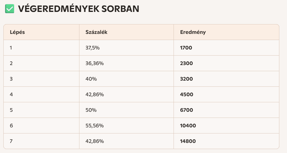 - Ha megvannak az új kezdőtétek, akkor jöhet az új maximum 8 lépéses challenge, a szorzó most is mindig 4,00 hozzávetőlegesen. Kicsit eltérhet, ha olyan meccsek vannak nem kell mindenáron elvenni vagy hozzátenni, de nagyjából ennyi legyen. Tehát az 1300 az 1. tét, utána a többi hét, itt az iménti felső táblázatban! Ebből kiszámolva a második hónapnyi játékunk táblázata, amit követni kell végig a második hónapban úgy, hogy nyolc lépésből egy bejöjjön! Ha nem, akkor vége a játéknak buktunk. Íme a táblázat: