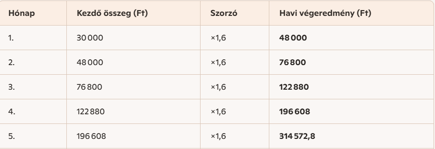 - A 30.000 kezdőtétből lett 49.300 ez pontosan 64,33%-os növekedés. Kerekítsünk lefelé, 60%-ra most is. Ha ez minden hónapban átlagosan megvan, akkor a 30.000 forintból az első hónap után lett 48.000, ebből a második hónap végére lett 76.800 és így tovább. Az 5. hónap után a vége 314.500 forint lesz a növekmény összege, vagyis kb megtízszereztük a kezdő bankunk összegét! És ehhez mi kell? „Csupán” annyi, hogy képesek legyünk 8 fogadásból egyszer nyerő 4,0-ás szelvényt játékba küldeni folyamatosan 5 hónapon keresztül! Mutatom a táblázatot:
