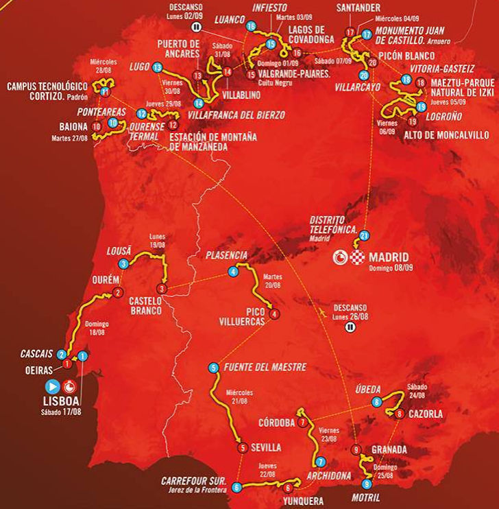 - Az idei Vuelta Portugáliából indul, három napot töltenek ott, majd irány át Spanyolországba, előbb a déli fertályon, aztán egy óriási váltás a pihenőnapon, felmennek északra. Onnét keleti irányba szelik át az országot, végül egy kemény hegyi szakasz után jön Spanyolország szívében, a madridi időfutam finálé.