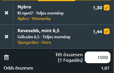 - Djurgarden – Mora: A svéd másodosztályú jégkorong-bajnokságban a Djurgårdens IF hazai pályán fogadja a Mora IK csapatát. A fogadóirodák egyértelműen a Djurgårdenst tartják esélyesebbnek, a hazai győzelem szorzója 1.36 körül mozog, pedig a Mora lehet meglepni a favorit hazai csapatot. A mérkőzés kulcskérdése az lesz, hogy a Djurgårdens támadósora mennyire tudja feltörni a Mora védekezését, illetve hogy a vendégek képesek lesznek-e stabilan tartani magukat az egész találkozón. Egy szoros, kemény ütközet várható, ahol a Djurgårdens esélyesebb, de a Mora IK pontszerzése sem kizárt. A gólokra érdemes fogadni, ahol a kevesebb, mint 6,5 találat reális!