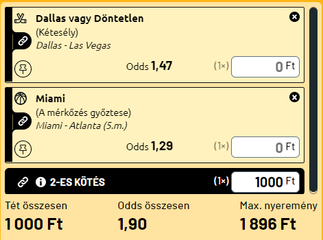 - Az év legfontosabb alapszakasz meccse talán. Egy kérdés maradt, a Dallas vagy a Vegas jut playoffba. 3 meccsel a vége előtt 3 pont a Dallas előnye a Lovagokhoz képest, kényelmes helyzetben vannak a hazaiak, ráadasul otthon fogadják a Vegast. A vendégeknél vannak hiányzók. Az idei évben a Dallas egy erős középcsapatnak mondható, a Vegas picit alulteljesítette az elvárasokat, vagy eljött a minimális visszaesés ideje a kiváló újonc évek alatt. A mai találkozó nagyon kétesélyes, de a hazai pálya és a 3 pontos előny kényelme a Dallas mellett szól. Nem nekik kell kapkodniuk, a Vegas feszült lesz mert nekik csak a rendes játékidőbeli siker elfogadható. A Dallas vereség esetén sem omlik össze mert még akkor is saját kezében a sorsa, ráadásul könnyű a maradék 2 meccs. Hazai közönség előtt egy X-re mindenképp jók a zöld fehérek, így a miami meccs mellé kombinációban kipróbálható.