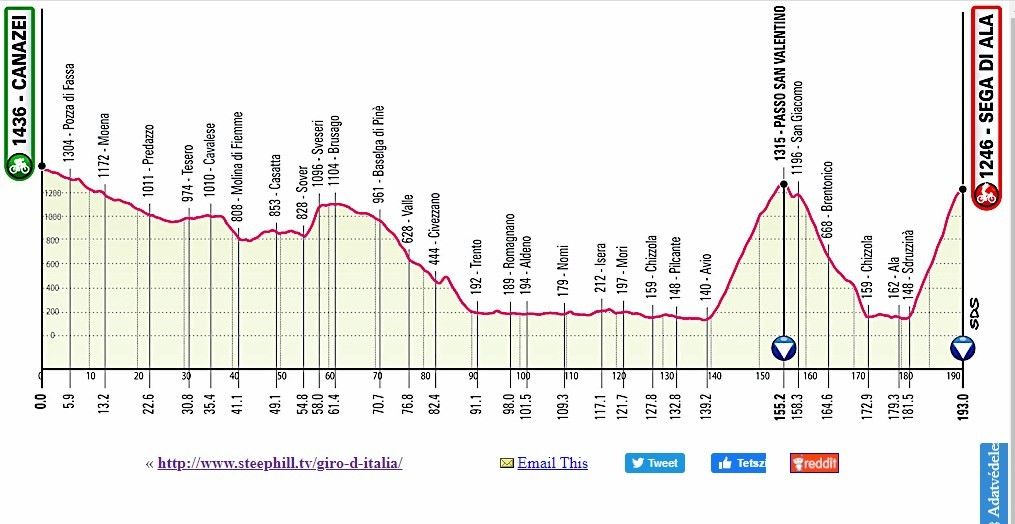 - A mai menet semlesz sokkal könnyebb, mint az eredetileg megtervezett királyetap, a végén megmásszák a Passo San Valentinót 1200 méter szintkülönbség 16 kilométeren, majd a végén hegyibefutó a Sega Di Alán, amely alkalmával 12 kilométer alatt emelkednek 1100 métert! Ezek nagyon kemény emelkedők!