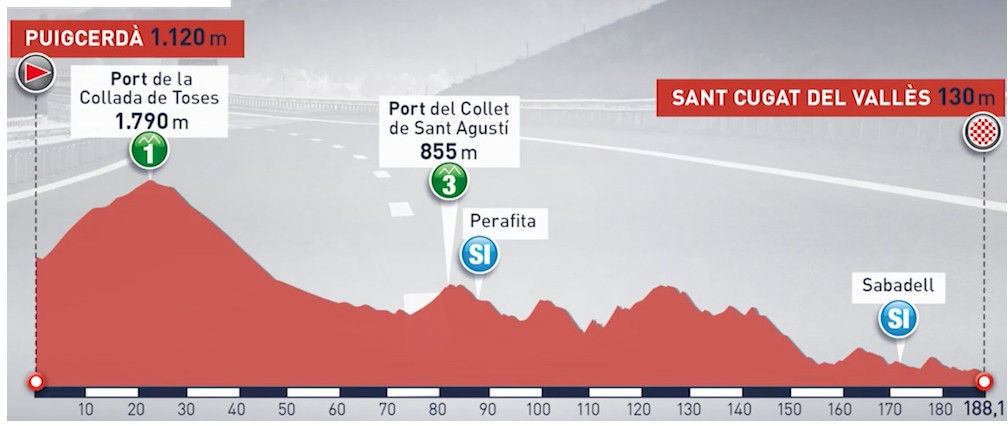 - A mai szakasz igencsak kedvez a szökésnek. Rögtön az elején egy 1-es kategóriás heggyel kezdenek, a Port de la Collada del Toses1790 méter magas. Utána hosszú lejtmenet, majd 75km-nél következik a 3-as Port del Collet de Sant Augusti, amely 855 méter magas. Utána már csak dombos a profil. Azt gondolom, hogy ma az összetettben érdekeltek inkább csak egymásra figyelnek majd és nem fognak mindent megtenni a győzelemért.