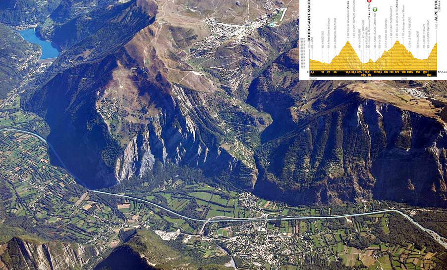 - Bourg Saint Maurice-ból indulnak, hogy aztán három ikonikus kiemelt kategóriás hegyet megmászva (Col de la Madeleine, Croix-de-Fer and L'Alpe d'Huez), az utolsón legyen hegyi befutó.