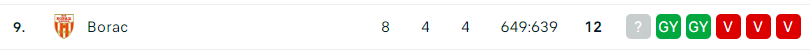 - A Borac javuló teljesítményt mutat. Négy győzelemmel és négy vereséggel jelenleg a tabella közepén állnak az ABA Ligában. A legutóbbi formájuk ígéretes, amit a Studentski Center (87-76) és az FMP (96-75) elleni két egymást követő győzelem jelez. Mindkét csapat részt vett az ABA Liga rájátszásában az előző szezonban, és hasonló ambíciókkal vágnak neki a mostani idénynek. Jól igazolt a csapat, a szezon kezdete előtt megszerezte Ronaldo Segu-t, Ja'von Franklin-t és Tylan Birts-et. Ez a három játékos vezeti jelenleg a Borac pontlistáját, Segu különösen domináns, aki 15,7 pontot átlagol!