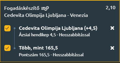 - A jelenlegi formák és a statisztikák alapján Cedevita Olimpija esélyesebbnek tűnik, hiszen hazai pályán különösen erős és stabil csapat benyomását kelti, míg Venezia a nehezebb idegenbeli meccseken rendre alulmaradt. A várakozások szerint a ljubljanai együttes magabiztos győzelmet arathat, még egy kis plusszos hendivel meg is tudjuk erősíteni, valamint minimum 166 pontot várhatunk!