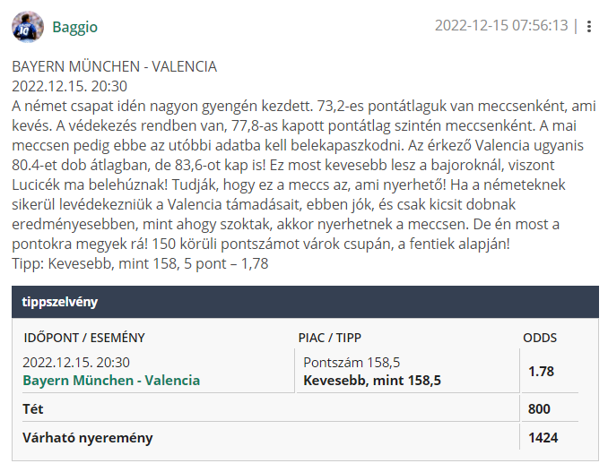 Ebben a rovatban az aktuális nap legjobb kosárlabda-fogadásait keressük.Elsősorban a nemzetközi kupákra és a legnagyobb európai bajnokságokra hegyezzük ki a történetet. De jöhet NBA is! Mostantól minden kosárlabda egy helyen. Számítunk Rátok!. Mivel ma is Euroliga-mérkőzések lesznek, várható volt Baggio bejelentkezése a Trükkös-rovatba. Nem is kellett csalódni. Az első mérkőzés, amit választott a Bayern München - Valencia meccs volt.