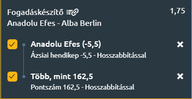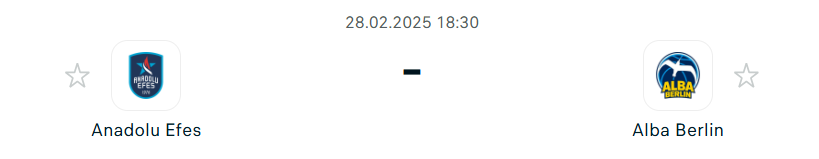 - Az Anadolu Efes kétarcú szezont fut, és jelenleg a 13. helyen áll 12-14-es mérleggel, papíron még van esélyük a rájátszásra. Az idény elején erős idegenbeli teljesítményt mutattak, de november 14. óta nem nyertek vendégként. Hazai pályán viszont hagyományosan erősek, és mivel a hátralévő nyolc meccsükből ötöt Isztambulban játszanak, komoly esélyük van a felzárkózásra. Legnagyobb erősségük a tapasztalat és a kulcsjátékosok, különösen Shane Larkin, aki egészségesen vezetheti a csapatot. Mellette Elijah Bryant is meghatározó szereplője az együttesnek, míg Rodrigue Beaubois, Ercan Osmani, P.J. Dozier, Darius Thompson, Daniel Oturu és Jordan Nwora is komoly potenciállal bír. Az Alba Berlin elleni mérkőzésen az Efes nem engedheti meg magának, hogy lebecsülje ellenfelét, és ha gyorsan magukhoz ragadják az irányítást, akár már a félidőben eldönthetik a találkozót. Egy esetleges botlás nagyban hátráltathatná rájátszásbeli esélyeiket.