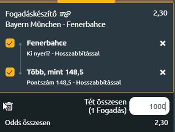 - A Fenerbahce az első idegenbeli győzelmét szeretné megszerezni az Euroligában, ehhez pedig München ideális helyszín. Már csak azért is, mert ebben a szezonban is nagy szurkolói támogatást kap ezen a mérkőzésen, kicsit mintha hazai csarnokban játszana. A Fenerbahce jobb csapat és ez ma ki fog jönni! Fenerbahce meccsgyőzelem + több mint 148, 5 pont a mérkőzésen.