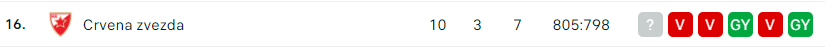 - A Crvena zvezda kosárlabdacsapata annak ellenére küzd a jelenlegi szezonban, hogy a nyáron egy igen tekintélyes játékoskeretet állított össze. A pillanatnyi mutató 3GY – 7V és ez nem mutatja valós erejüket. A Top 8-as és Final Four-támadásra irányuló kezdeti ambíciók ellenére a 16. helyen találják magukat, itt az idő lassan átértékelni a célokat, vagy pedig egy hatalmas javulást kellene véghezvinni. Komoly probléma a külföldi játékosok, különösen Mike Tobey és Shabazz Napier alulteljesítése, akiktől jelentős erősítést vártak. A védekezés alapemberei, Branko Lazic és Hanga Ádám sérülés miatt kiesett, ami tovább nehezíti a csapat védekezési képességeit.