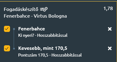 - Figyelembe véve, hogy a Fenerbahce a liga legjobb védelmét adja és mindkét csapat lassabb, defenzív fókuszú stílust játszik, várhatóan alacsony pontszámú mérkőzésre számíthatunk, ahol az idegenben általában gyengébb Virtus ma is vereséget szenvedhet!