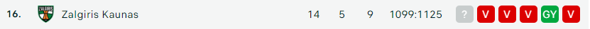 - Ezzel szemben a Zalgiris jelenleg gyenge formával küzd, öt győzelmet és kilenc vereséget könyvelhet el, ami jelentős visszaesés az előző szezonban nyújtott teljesítményéhez képest. Az Euroligában zsinórban három vereséget szenvedtek el, az utolsó öt meccsükön pedig csak egy győzelmet arattak. Múlt héten Kaunasban meggyőző vereséget szenvedtek a Partizan ellen, 85-93-as végeredménnyel. Az eredmény ellenére a Zalgiris végig alárendelt helyzetben volt, a Partizan az elejétől a végéig kézben tartotta az irányítást. A mérkőzés után találgatások merültek fel Kazys Maksvytis edző esetleges kirúgásáról. A litván média beszámolói szerint azonban Maksvytis továbbra is élvezi a játékosok támogatását, akik úgy vélik, hogy a csapat túl tud lépni a jelenlegi válságon.