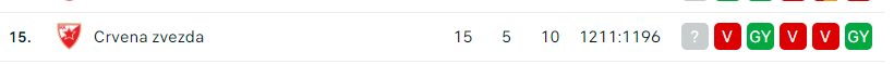 - Ezzel szemben a Crvena Zvezda kedden meggyőző, 58-72-es vereséget szenvedett a Real Madridtól, ami az elmúlt négy mérkőzésen a harmadik vereségét, és a szezonban a tizedik vereségét jelentette. Ioannis Sfairopoulos csapata feltűnően küszködött, érdektelenséget, és a szükséges agresszivitás hiányát mutatta védekezésben. Támadásban problémákkal küszködtek, ami az utóbbi időben egyre erősödő tendenciát jelzi a teljesítményükben. Shabazz Napier távolléte a mérkőzésről felerősítette a találgatásokat az esetleges klubváltásával kapcsolatban. Továbbá Ognjen Kuzmic távozni készül a klubtól, Mike Tobey pedig pozícióváltás előtt áll, ami hozzájárult a csapat zavaros időszakához.