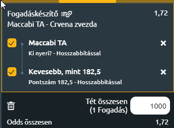 - Tekintettel a Maccabi Tel Aviv jobb formájára és a Crvena Zvezdához képest pozitívabb csapathangulatára, úgy véljük, hogy az izraeli csapat jobb helyzetben van ahhoz, hogy megnyerje a meccset és a jó védekezésnek megfelelően underes megközelítés van a pontok felé.