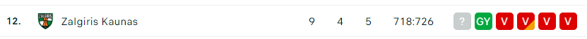 - A Zalgiris is felemásan játszik az idei szezonban. 4 GY és 5 V a mérleg, legutóbb egy rossz sorozatot tudtak lezárni a Bayern München elleni győzelemmel. A meccsen Keenan Evans az utolsó másodpercekben szerzett győztes pontokat! A litván csapatra elsődlegesen a harciasság, a küzdőszellem és az utolsó percig való koncentráció jellemzi. A Zalgirist soha nem szabad leírni, még akkor sem, ha kétszámjegyű hátrányban vannak, mert mindig van valaki, aki meccsben tartja a csapatot. Legtöbbször Keenan Evans az, kétségtelen, hogy ő a litván csapat legjobbja. Az Efes ellen 20 pontot szerzett, és ebből még 15-öt is a negyedik negyed utolsó 5 percében. A Zalgiris sokat fut ebben a szezonban és igyekszik gyorsítani a játékot, ami az Olympiakosz elleni meccs egyik kulcsa lehet, ahogyan fontos lesz a hárompontos kísérletek sikeressége is. A "zöldek" a liga legjobban dobó csapata, és 43%-os a csapat hárompontos statisztikájuk.
