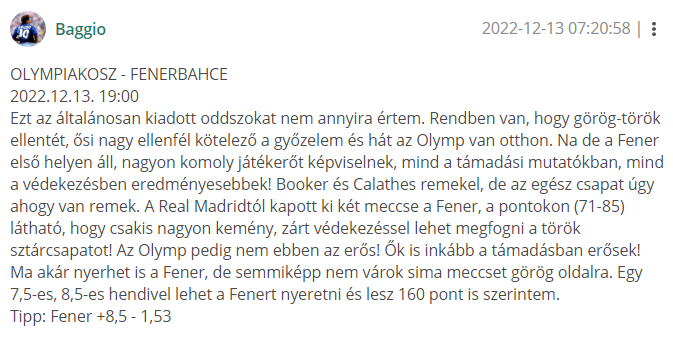 Ma is lesz Euroliga a kosárlabdázás legmagasabb szintje európai szinten. Baggio két tippet is hozott mára. Az első a Fenerbahce athéni vendégjátéka.