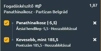 - A Panathinaikosz legutóbbi meccsei és a Partizan gyenge teljesítménye alapján a görög csapat dominálni fog, és kényelmes, biztos győzelemre van kilátás! A hazaiak legalább hat pontot közé raknak, mivel a vendéggárda nagyon gyenge formában van, a Pana nem nagyon engedi majd őket érvényesülni. Nem várható 185 pontnál több a mérkőzésen.