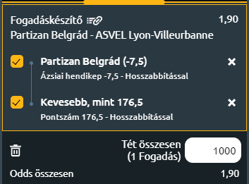 - A Partizan jelentős előnyben van edzői minőségben, Zeljko Obradovic stratégiai képességei felülmúlják Gianmarco Pozzeccoét. Emellett a Partizan játékoskerettel, jobb egyéni minőséggel és több tapasztalattal büszkélkedhet. A fekete-fehérek elsöprő győzelme várható, ami tükrözni fogja a pályán mutatott fölényüket. A Partizant is el lehet indítani kicsi mínuszból, valamint a pontszám tekintetében 160 körül várható. Mivel a over-under határ elég magas, inkább az under-oldalról közelítek: