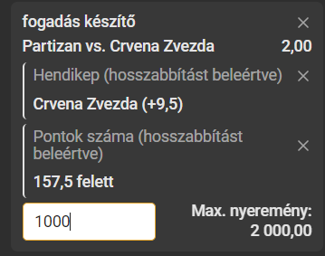 - Mindkét csapat jelentős védekezési problémákkal küzdött az utóbbi időben. Ennek eredményeképpen ma is az over oldaláról kell közelíteni és mindehhez én egy viszonylag kiegyenlítettebb meccset várok, mint a bukik. A szorzók alapján a Partizan jelentősen esélyesebb, de szerintem nem olyan nagy a különbség. Mivel ez egy nagy rangadó, a Zvezda is oda fogja tenni magát és a végén nem lesz közöttük 10 pontnyi differencia és lesz a meccsen minimum 158 pont is.