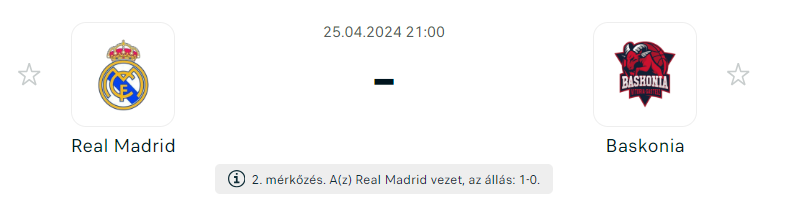 A Real Madrid és a Baskonia ismét Madridban csap össze, az Euroliga rájátszás-,negyeddöntős sorozatának második mérkőzésén. A Real igazolta erőfölényét és 16 ponttal nyerte meg az első összecsapást. Ma sem sok jóra számíthat a baszk együttes.